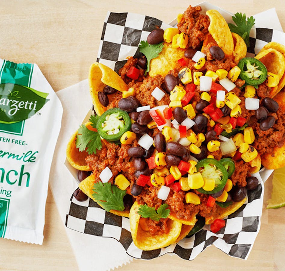 For takeout and delivery pack chips and toppings separately to preserve crunchiness and include a 1.5 oz. Marzetti® Buttermilk Ranch packet